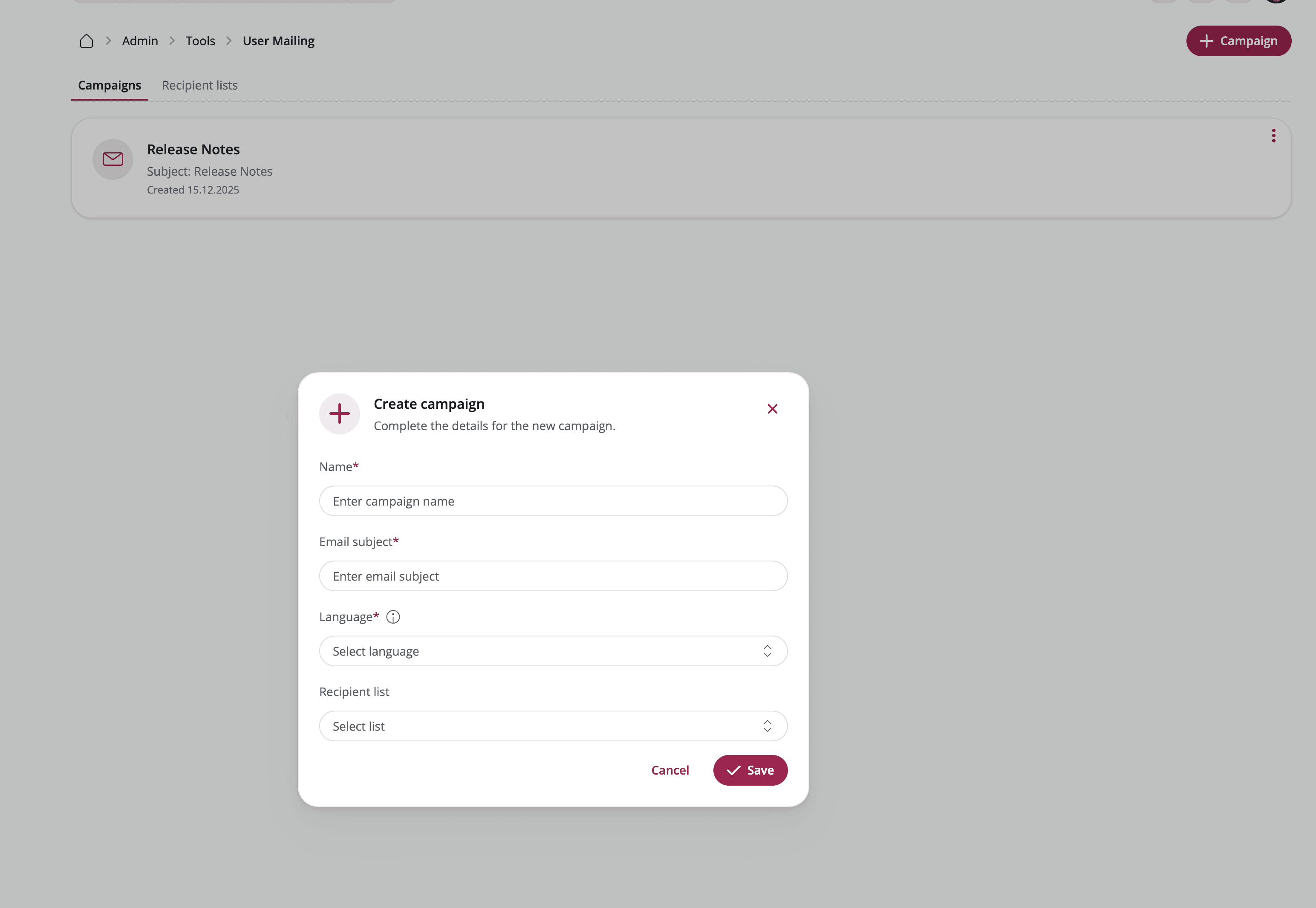 - Navigate to Admin → Tools → User Mailing → Campaigns.