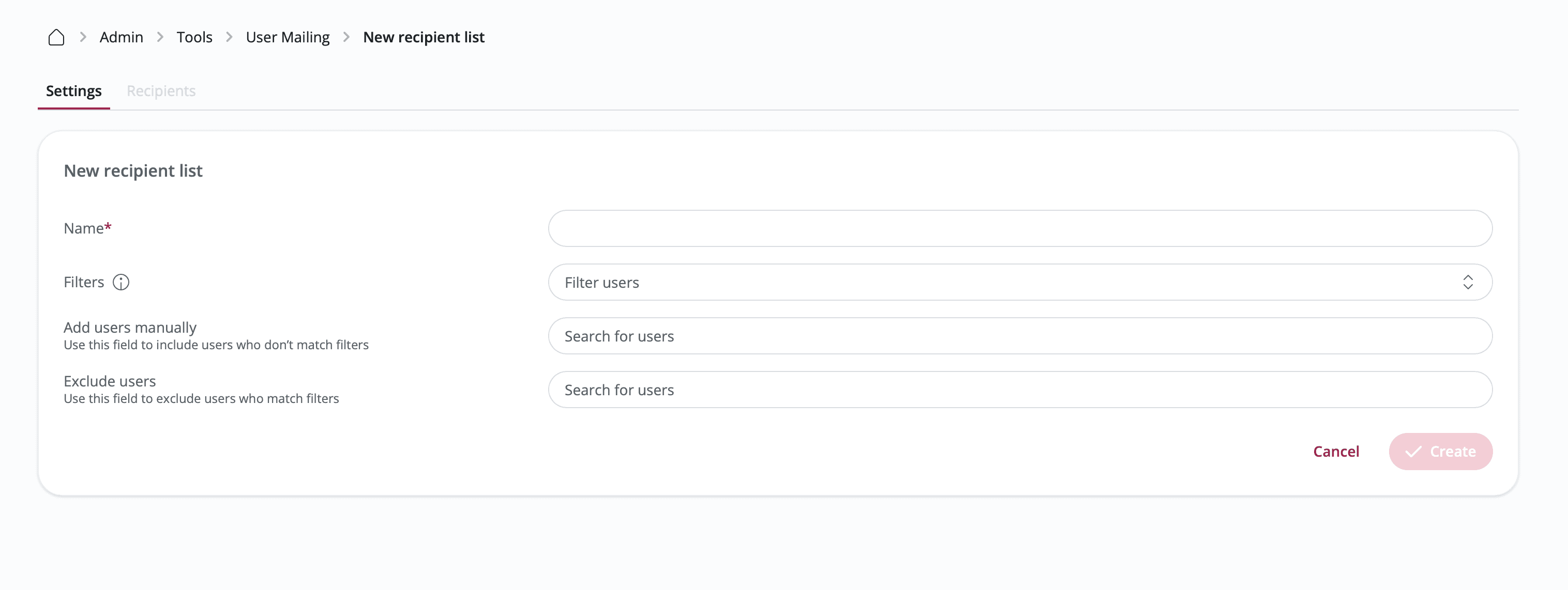 - Navigate to Admin → Tools → User Mailing and click the "Recipient Lists" tab.
