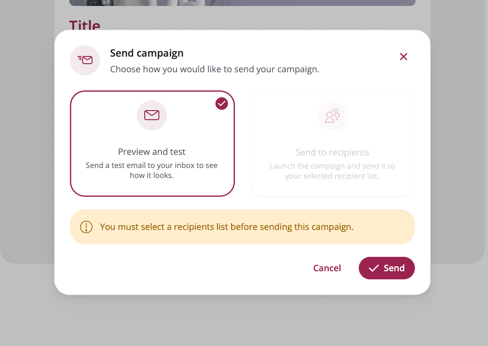 Can I send to users without a recipient list? No, you must select a recipient list before sending a campaign. This ensures targeted, relevant communications.