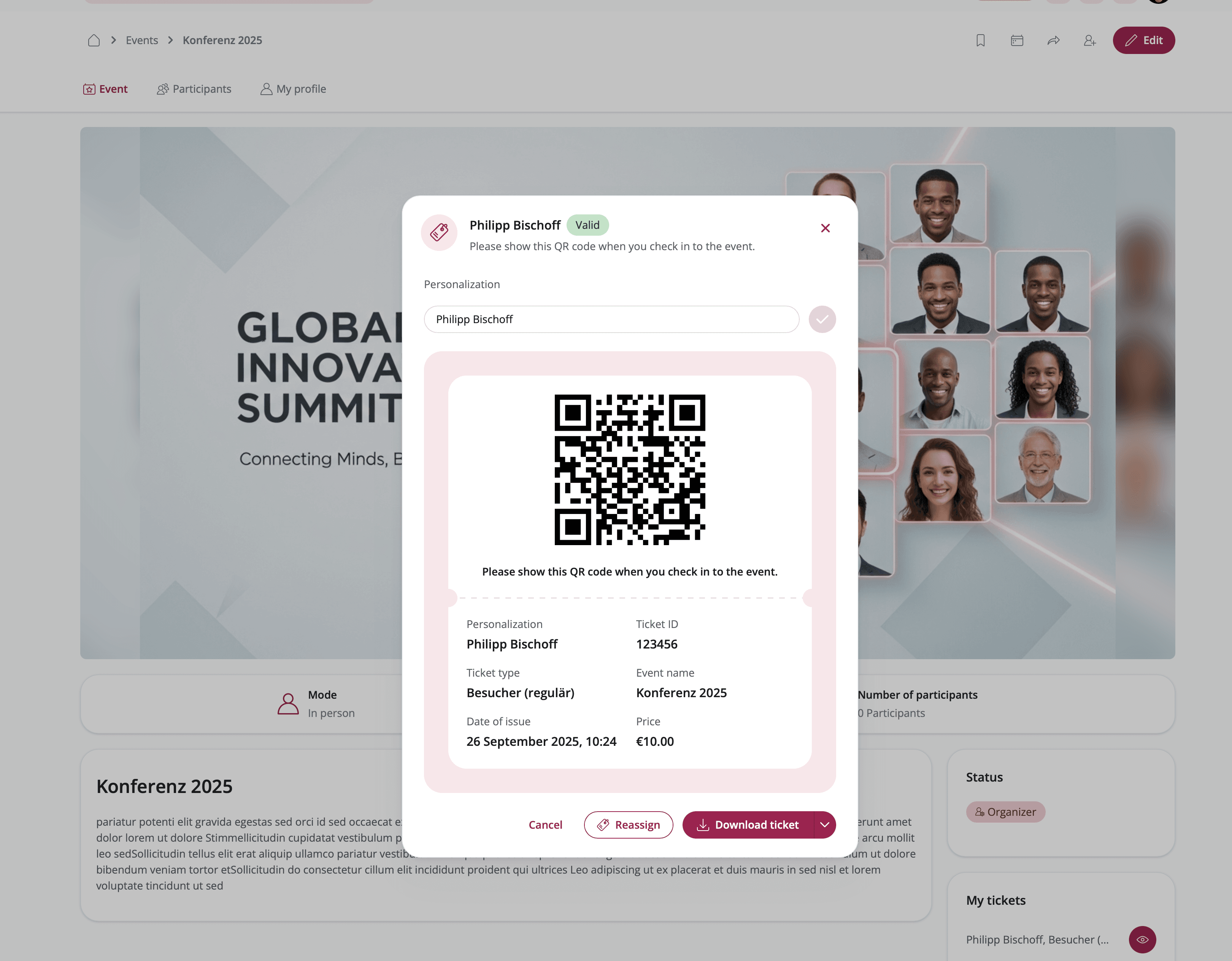 Ticket Reassignment: Enable ticket holders to transfer their tickets to other platform users when plans change. Organizers maintain full control with the ability to reassign any ticket, regardless of settings.