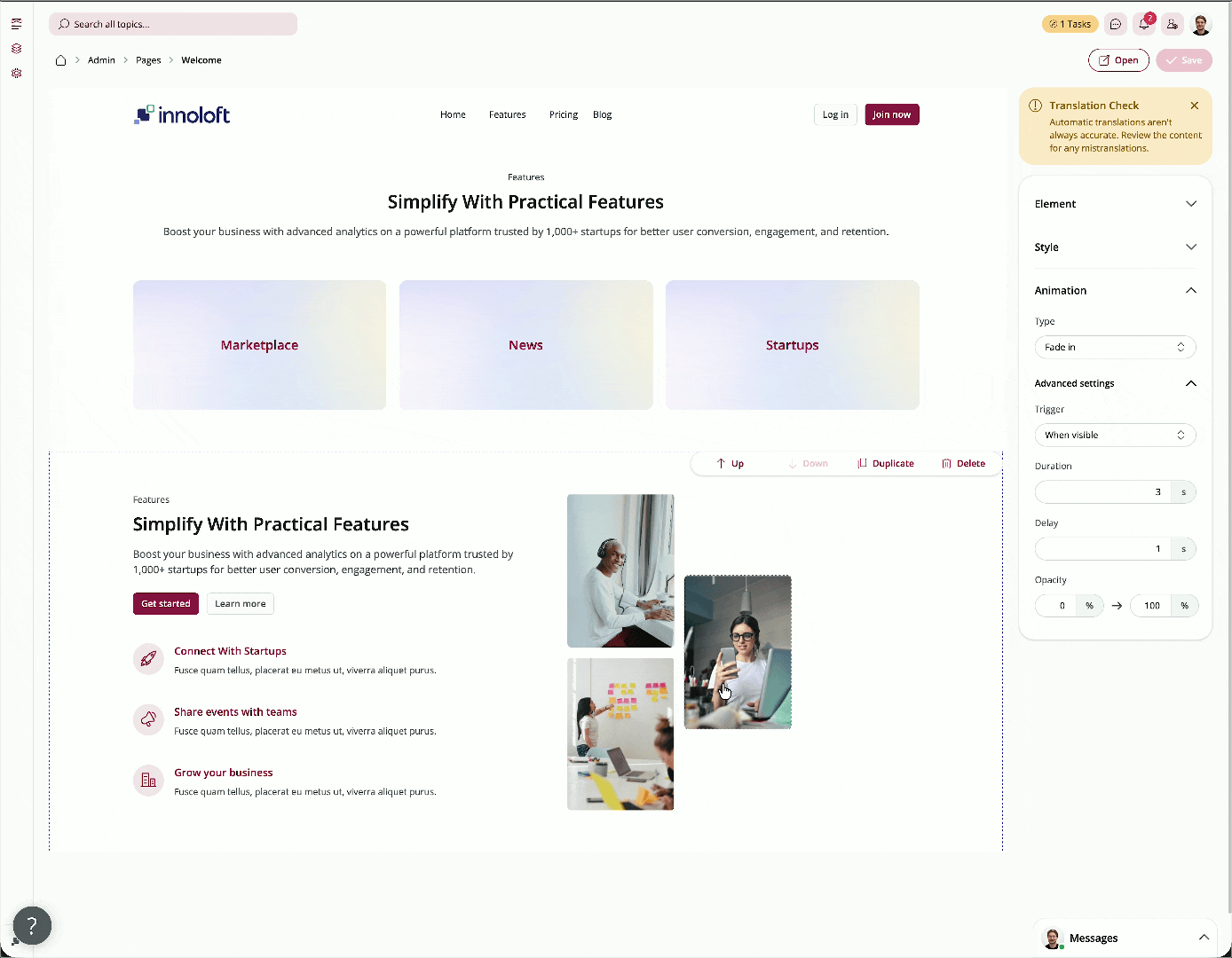 Navigate to Admin â Modules â Pages and open any page in the editor. Select an element or template, then access the new Animation Settings to start adding dynamic animations to your content. Experiment with different animation types, directions, and timing to create engaging experiences that captivate your visitors!