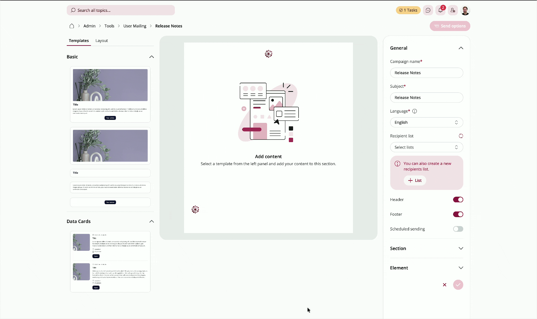- Visual Email Editor: Design professional emails with our intuitive drag-and-drop editor. Choose from Basic templates (text, images, buttons) or Data Cards to showcase platform content like events, organizations, and custom modules.
